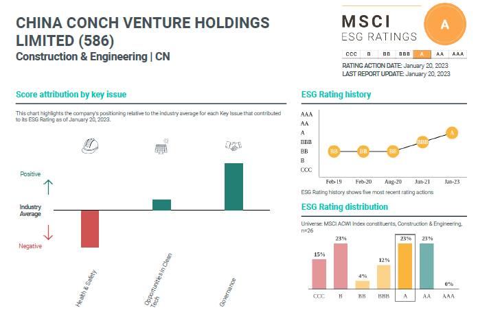 近日,全球最大指數(shù)公司明晟MSCI公布了全球最新一期ESG報告評級,海螺創(chuàng)業(yè)憑借優(yōu)異的企業(yè)管治水平,公司ESG報告評級由“BBB”躍升至“A”,為全球各大投資機構(gòu)決策提供重要依據(jù)。本次評級進一步體現(xiàn)了公司的投資價值,增強了公司在全球資本市場中的影響力。