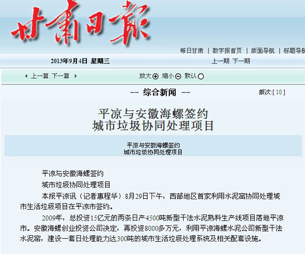 ??? 2009年,總投資15億元的兩條日產(chǎn)4500噸新型干法水泥熟料生產(chǎn)線項(xiàng)目落地平?jīng)鍪?。安徽海螺?chuàng)業(yè)投資公司決定,再投資8000多萬(wàn)元,利用平?jīng)龊B菟喙拘滦透煞ㄋ喔G,建設(shè)一套日處理能力達(dá)300噸的城市生活垃圾處理系統(tǒng)及相關(guān)配套設(shè)施。